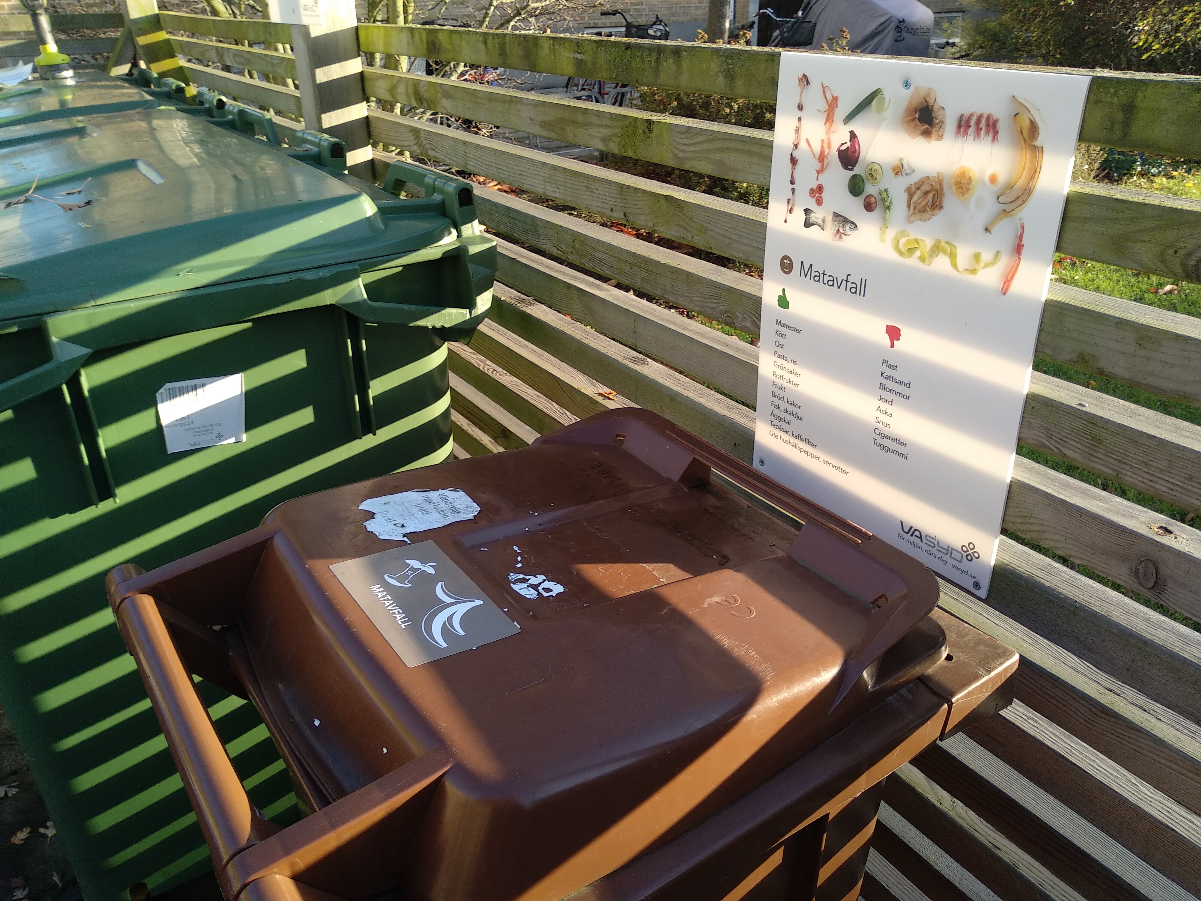 I den bruna tunnan slängs matavfall. Gratis påsar finns i källaren bredvid cykelförrådet.